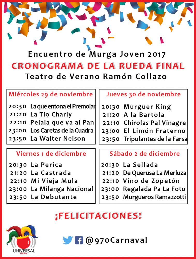 Cabe destacar que el miércoles, viernes y sábado, subirán al Teatro a las 20:00 hs. en condición de fuera de concurso, Murga Obra Ensueño (de San Carlos), Murga Del Timbó y murga La de Acridu, respectivamente.