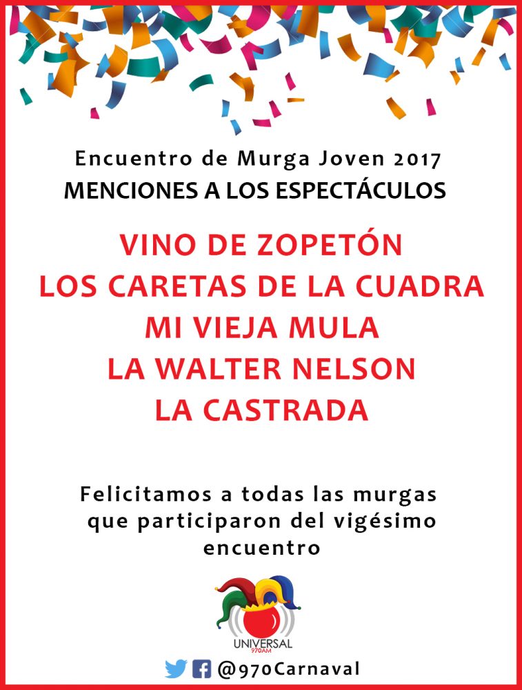 A continuación, la lista completa de menciones del encuentro de Murga Joven 2017: