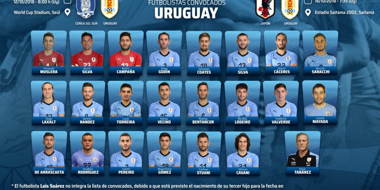 El futbolista Luis Suárez no integra la lista de convocados, debido a que está previsto el nacimiento de su tercer hijo para la fecha en que se disputarán los amistosos ante Corea y Japón. De adelantarse los plazos, el jugador podrá quedar a disposición de la selección.