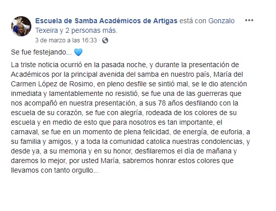 La Escuela de Samba Académicos emitió un mensaje bajo el título “Se fue festejando”: