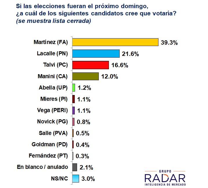 Daniel Martínez 39,3 %, Luis Lacalle Pou 21,6 %, Ernesto Talvi 16,6 % y Guido Manini Ríos 12 % surge tras una nueva muestra de intención de voto, de cara a las elecciones de octubre.