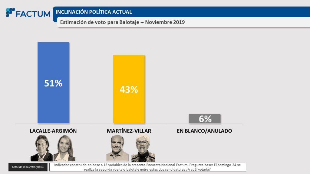 Según una encuesta de la consultora Factum, el próximo domingo Lacalle Pou obtendría el 51% de los votos y Daniel Martínez el 43%.