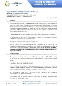La Unidad Disciplinaria de la Confederación Sudamericana de Fútbol le abrió un expediente al delantero boliviano Marcelo Moreno Martins, por criticar al órgano y la realización de la Copa América, una vez el Ministerio de Salud de Brasil dio a conocer los 52 casos positivos de Covid 19 registrados en torno al evento hasta el momento, de los cuales uno le corresponde.