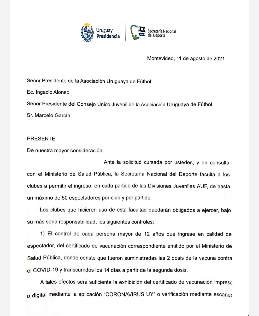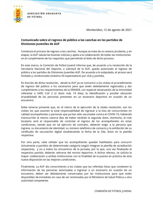 La Secretaría Nacional de Deporte (SND), notificó a la Asociación Uruguaya de Fútbol (AUF), la habilitación de ingreso de un máximo de 100 personas para todos los partidos de formativas, que serán distribuidas en 50 para cada institución involucrada en el cotejo.