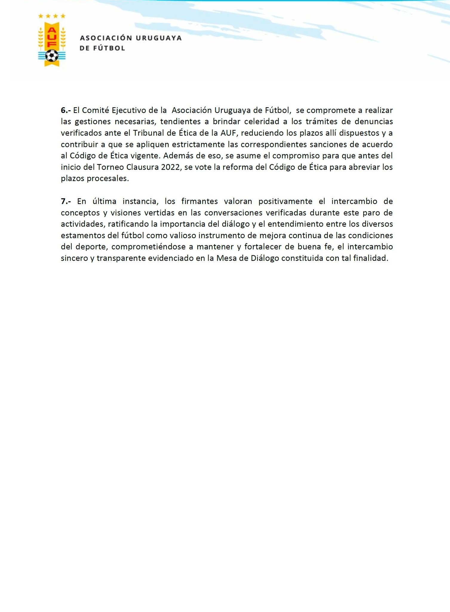 Cada uno será responsable de sus dichos y la magnitud de lo que reflejen, será resorte del análisis del Tribunal de Ética, que posiblemente sume a un miembro de AUDAF a sus filas, y actúe con potestades del Ejecutivo de AUF, con mayor celeridad para la toma de decisiones, en aplicar el Código Reglamentario vigente. Esto pasaría de 120 a 60 días.