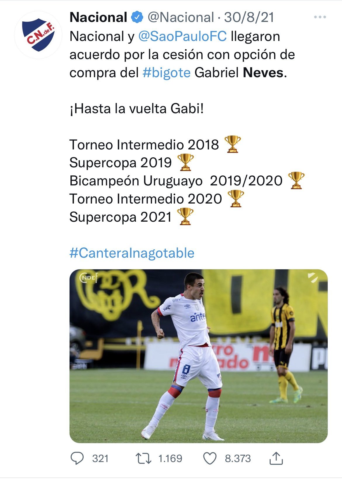 El 16 de julio de 2020, Gabriel Neves renovó contrato con Nacional por dos años y medio, luego de varias instancias de negociaciones entre el club y el representante.