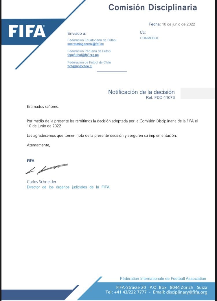 La decisión de la Comisión Disciplinaria de la FIFA se ha notificado hoy a las partes afectadas. De conformidad con el Código Disciplinario de la FIFA, las partes disponen de diez días para solicitar la decisión fundamentada. Esta decisión puede ser recurrida ante la Comisión de Apelación de la FIFA.