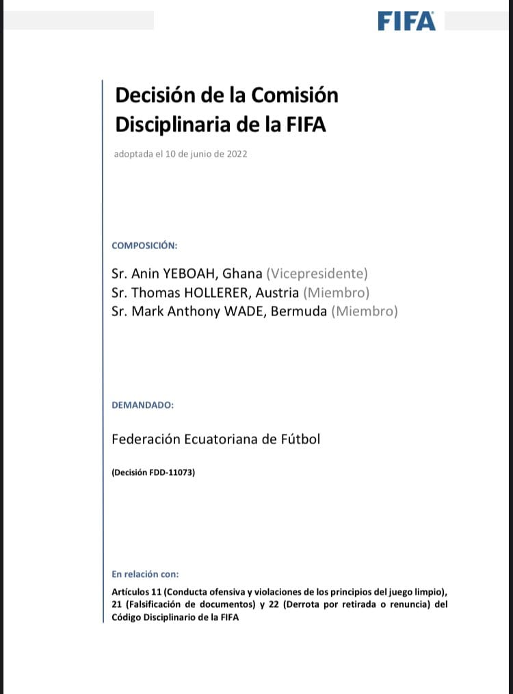 La Comisión Disciplinaria de la Federación Internacional de Fútbol Asociado (FIFA), dio su veredicto en torno a la investigación del caso Byron Castillo, dando por finalizado el expediente y por tanto, ratificando la participación de Ecuador en el Campeonato Mundial de Qatar 2022.