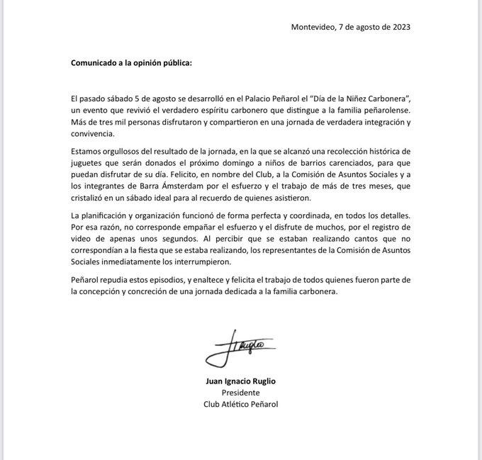 El presidente del Club Atlético Peñarol, Ignacio Ruglio, lanzó un comunicado este lunes en el que se refiere a la celebración del Día de la Niñez Carbonera y a los cánticos alusivos a la muerte de un hincha de Nacional que allí se dieron. Este hecho se produjo el pasado sábado 5 de agosto en el Palacio Peñarol.