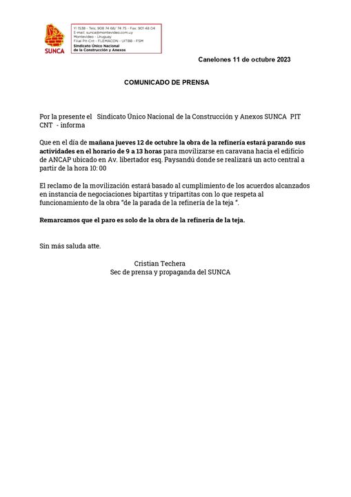 El comunicado expresa que en reclamo del “cumplimiento de los acuerdos alcanzados en instancias de negociaciones bipartitas y tripartitas con lo que respecta al funcionamiento de la obra “de la parada de la Refinería de La Teja «».