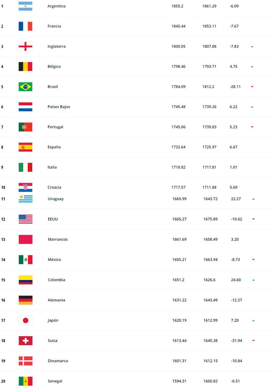 El conjunto celeste pasó de 1643.72 puntos a 1665.99. El primer puesto lo ocupa Argentina -rival que venció nuestra selección la pasada doble fecha de las Eliminatorias Sudamericanas- actual selección campeona del mundo, seguido por Francia (otra selección finalista de la copa del mundo) y termina con Inglaterra.