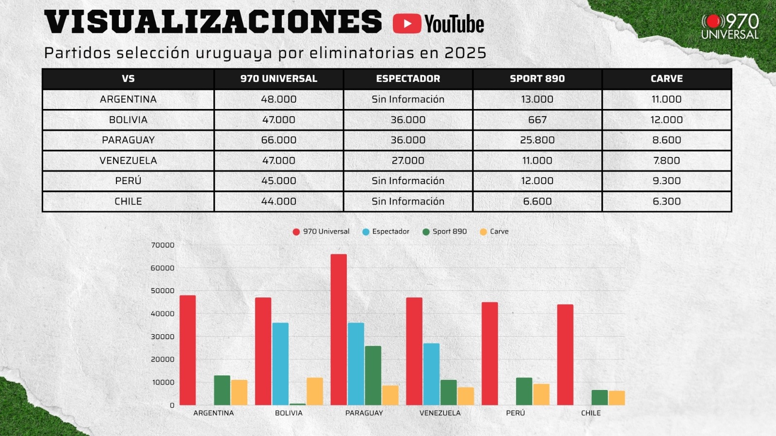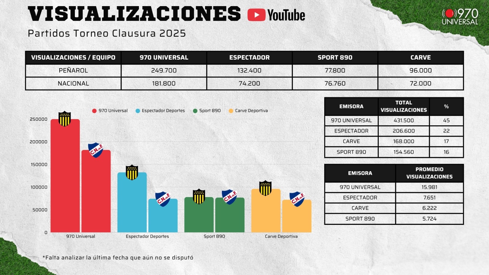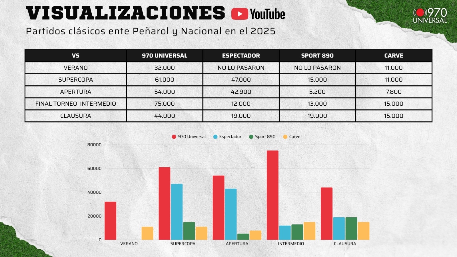 Los números hablan por sí solos. Según los datos públicos y medibles de YouTube, 970 Universal lidera en visualizaciones durante los partidos más importantes del fútbol uruguayo.